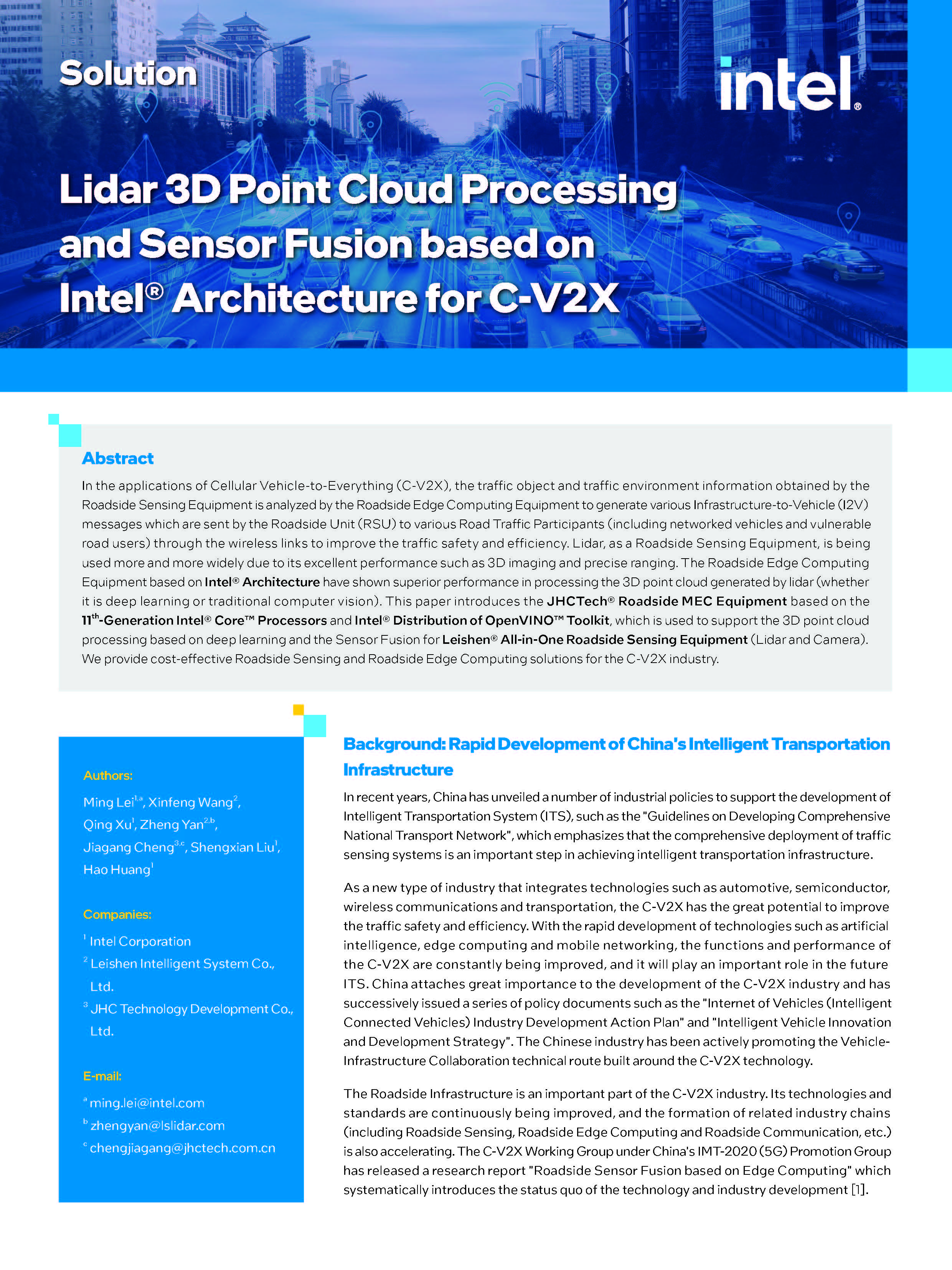 Lidar 3D Point Cloud Processing and Sensor Fusion based on Intel® Architecture for C-V2X