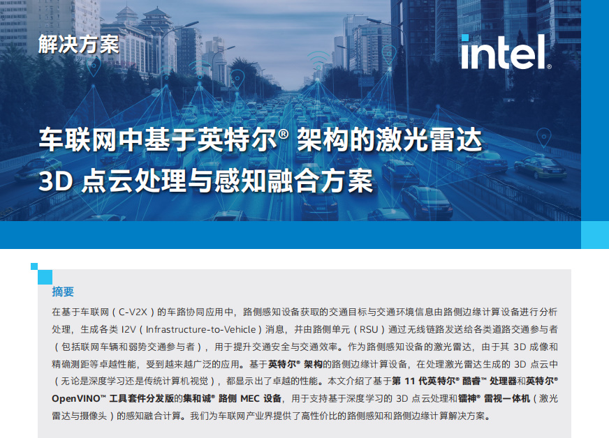 近日,英特尔完成了车联网中基于英特尔架构的激光雷达3D点云处理与感知融合方案白皮书的审核,对外公开了路侧感知和路侧边缘计算解决方案。